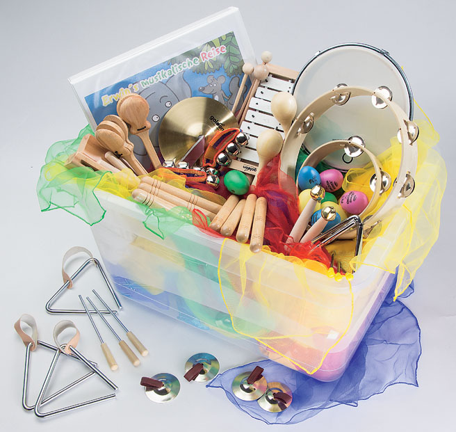 Пластмасова кутия с колеца и капак, пълна с 34 музикални инструмента: