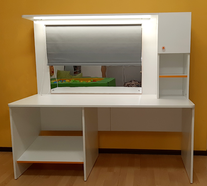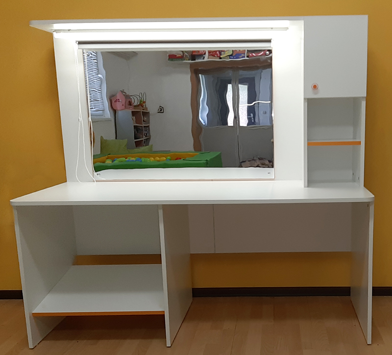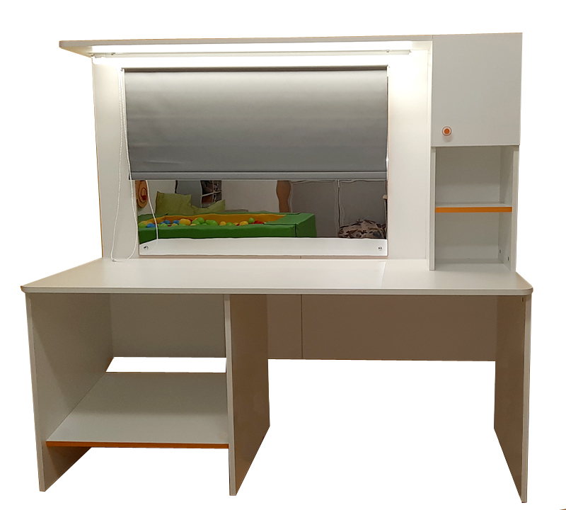 Съставено е от бюро с надстройка с гръб. Върху гърбът е монтирано стъклено огледало – задължителен атрибут в логопедичната терапия. Над огледалото има вградено осветление, което гарантира по-добрата видимост при изпълнение на артикулационните упражнения. Пред огледалото може да се спуска щора. По този начин се редуцират ненужните сетивни стимули и пациентът може по-лесно да се концентрира върху работата, която извършва на бюрото.