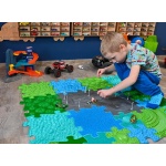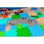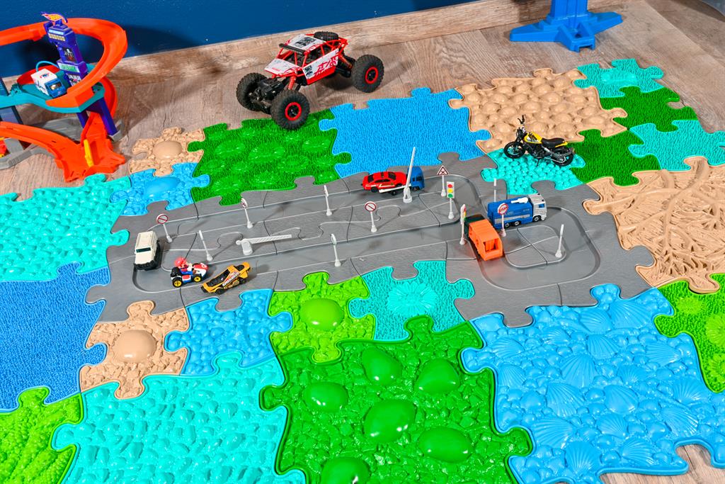 Размерът на пистата е проектиран така, че всяка количка, която вече имате у дома, да може да се движи по нея. Благодарение на интуитивните сглобки дори най-малките деца ще могат сами да сглобяват пистата. Сглобката е напълно съвместима с нашите сензорни пътеки пъзел, което Ви позволява да моделирате обкръжението около пистата по Ваш вкус. Заобиколете го с гора, ливада, трева или дори крайбрежие. Децата ще играят, докато стимулират тактилно дланите на ръцете и стъпалата на краката си, укрепвайки глезените и центъра на тялото си. Автописта, сензорно килимче и ортопедично помощно средство едновременно? Защо не!? Ето това Ви предлага магнитната пъзел писта за автомобили!