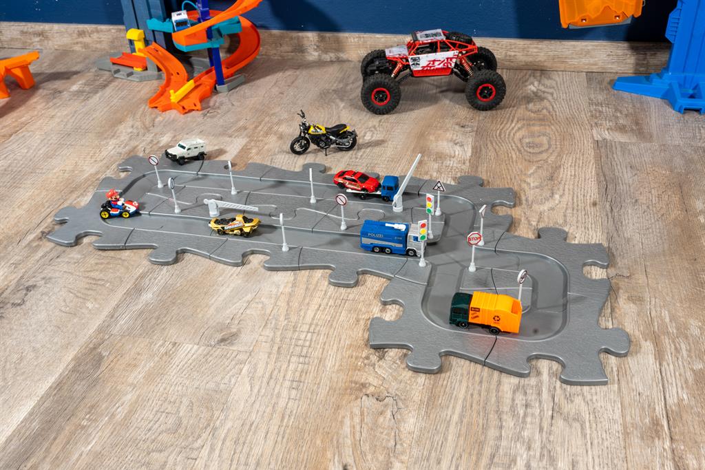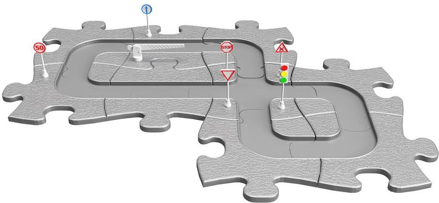 Изградете пистата според собственото си въображение! На Ваше разположение има завои, прави отсечки и кръстовища. Можете да допълните пистата с пътни знаци или бариери, които благодарение на вградения магнит в тях и в пистата винаги ще стоят на мястото си.