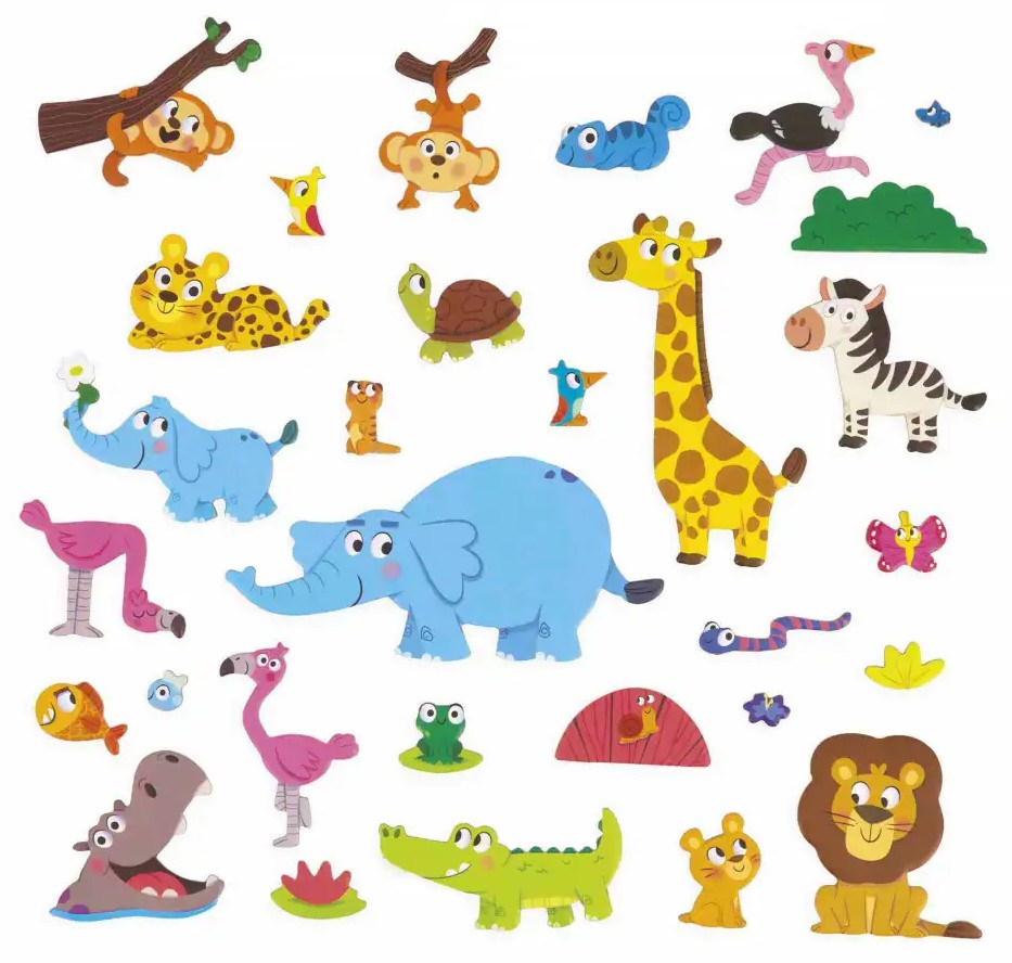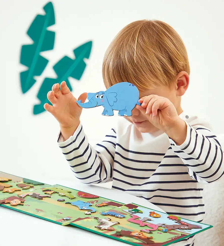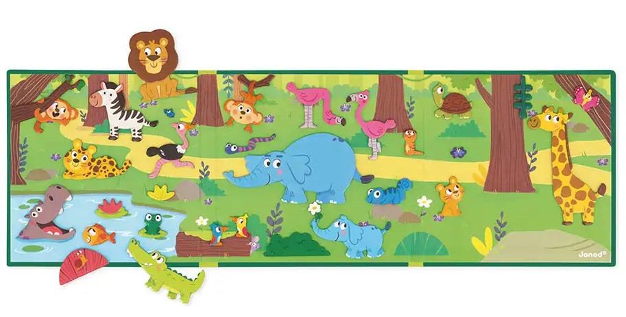 Детето подрежда магнитите върху дъската, пресъздавайки сцени от дивата природа като среща със слон, разходка на жираф или наблюдение на лъв. Когато дъската бъде поставена вертикално, то може да разкаже историята си, което подпомага езиковото развитие.