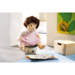 Материали: тялото е изработено от еластичен, лесен за почистване и приятен на допир плат, 100% полиестер. Ръчно пране с вода до 30 градуса. Пълнеж – зърнест гранулат. Дрехи – 100% памук.