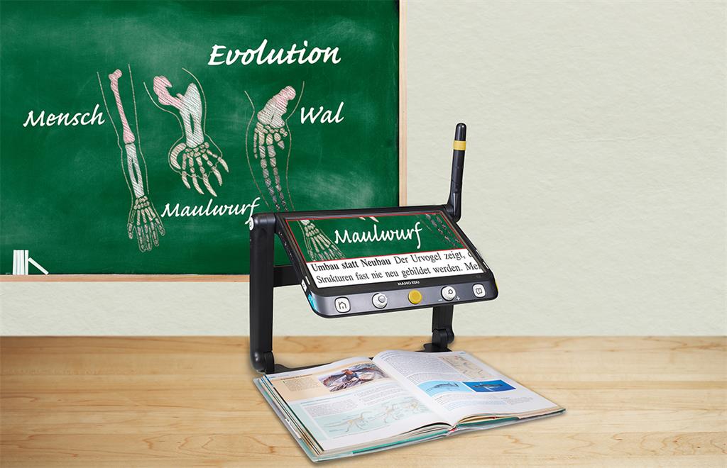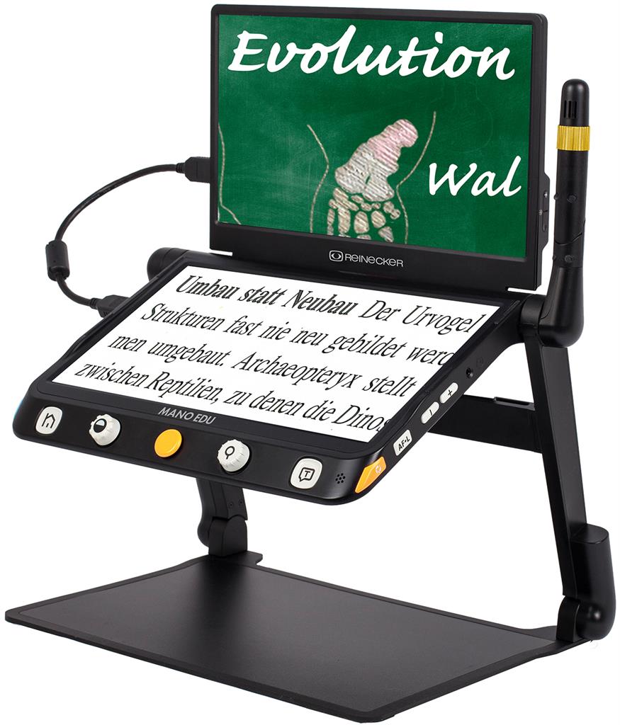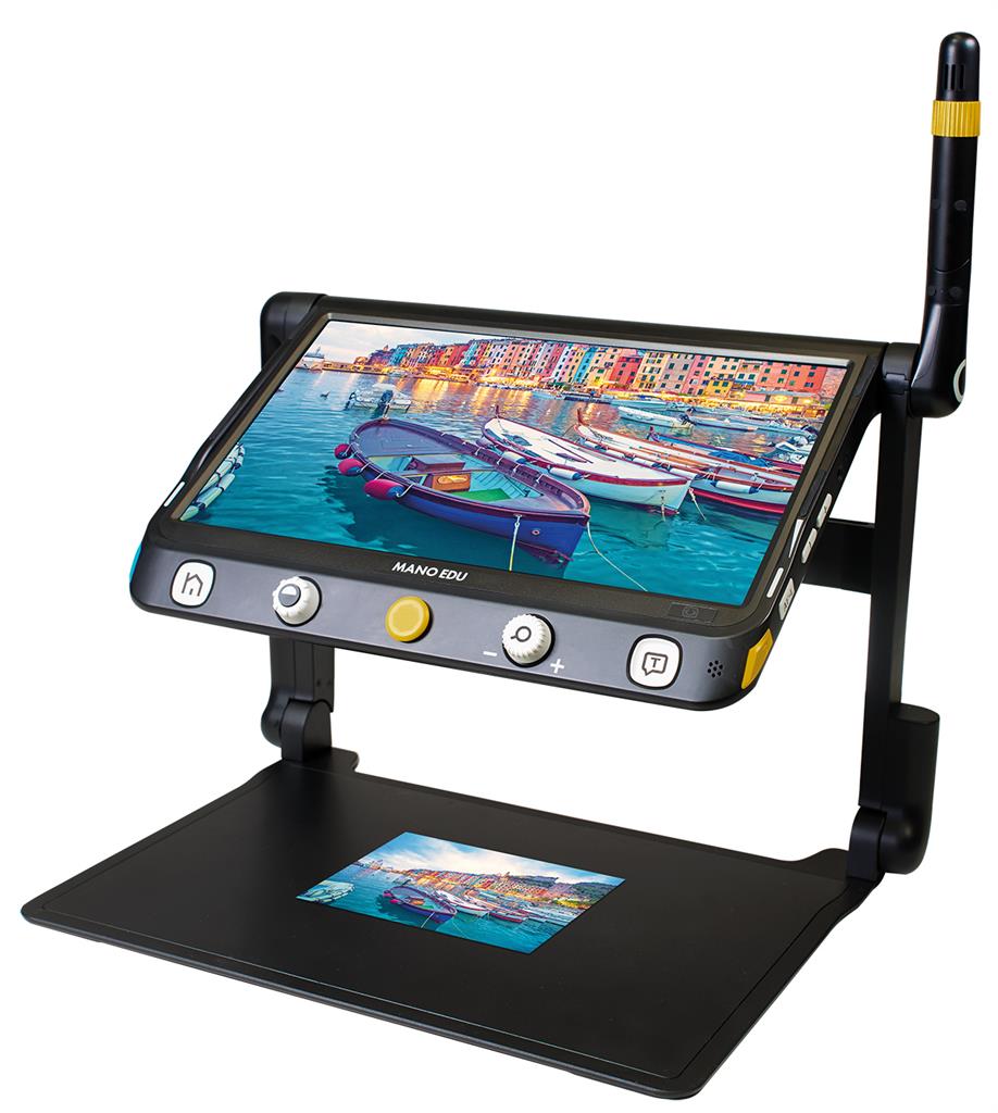 „MANO EDU – преносим видео увеличител с 2 камери и гласова функция“ работи на батерии и е снабдено със сгъваем статив. Разполага с две камери (една за четене и една за гледане от разстояние), като втората позволява въртене във всички посоки. И двете камери са с Ultra HD 4K резолюция и изображенията могат да се гледат едновременно на сензорния дисплей посредством интегрираната функция за разделяне на екран. Дисплеят позволява позициониране под ъгъл съобразно индивидуалните нужди, а вградената функция за корекция на трапецовидната картина компенсира наклона за още по-голям комфорт при работа.