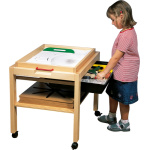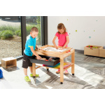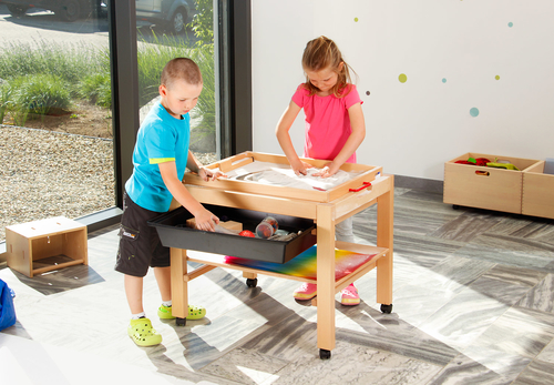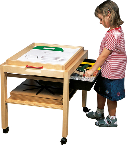 Съдържание / материали: Масичка, изработена от масивна букова дървесина. Рафтовете и плотът са от лакиран буков шперплат. С 4 колелца със заключване. Идеален начин за съхранение на голямата пясъчна табла L (102201) и всички аксесоари към нея.