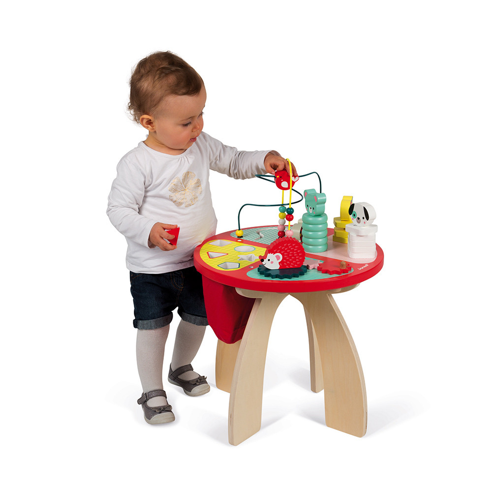Дървена масичка с 4 различни зони с развиващи игри за най-малките деца. Включва сортер-низанка с 3 степени на трудност под формата на животни, лабиринт с мъниста и животни за проследяване, подвижен пъзел със зъбни колела и 5 геометрични фигури за вгнездяване.