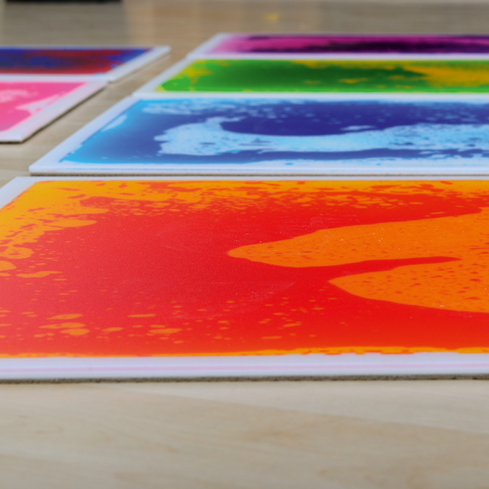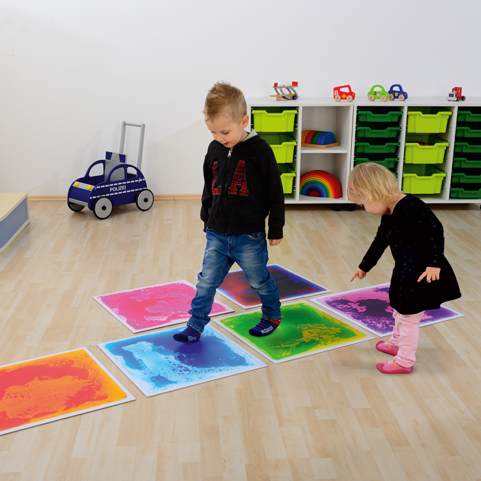 Комплект от 6 броя маслени гел плочи за под. При натиск цветната течност вътре се движи и смесва, като създава впечатляващи визуални ефекти. Плочите са изработени от висококачествени материали. Те са изключително здрави и имат непързалящо се покритие на задната страна. Върху тях може да се стъпва и върви.