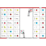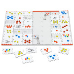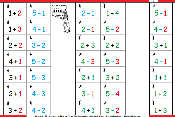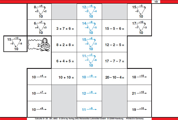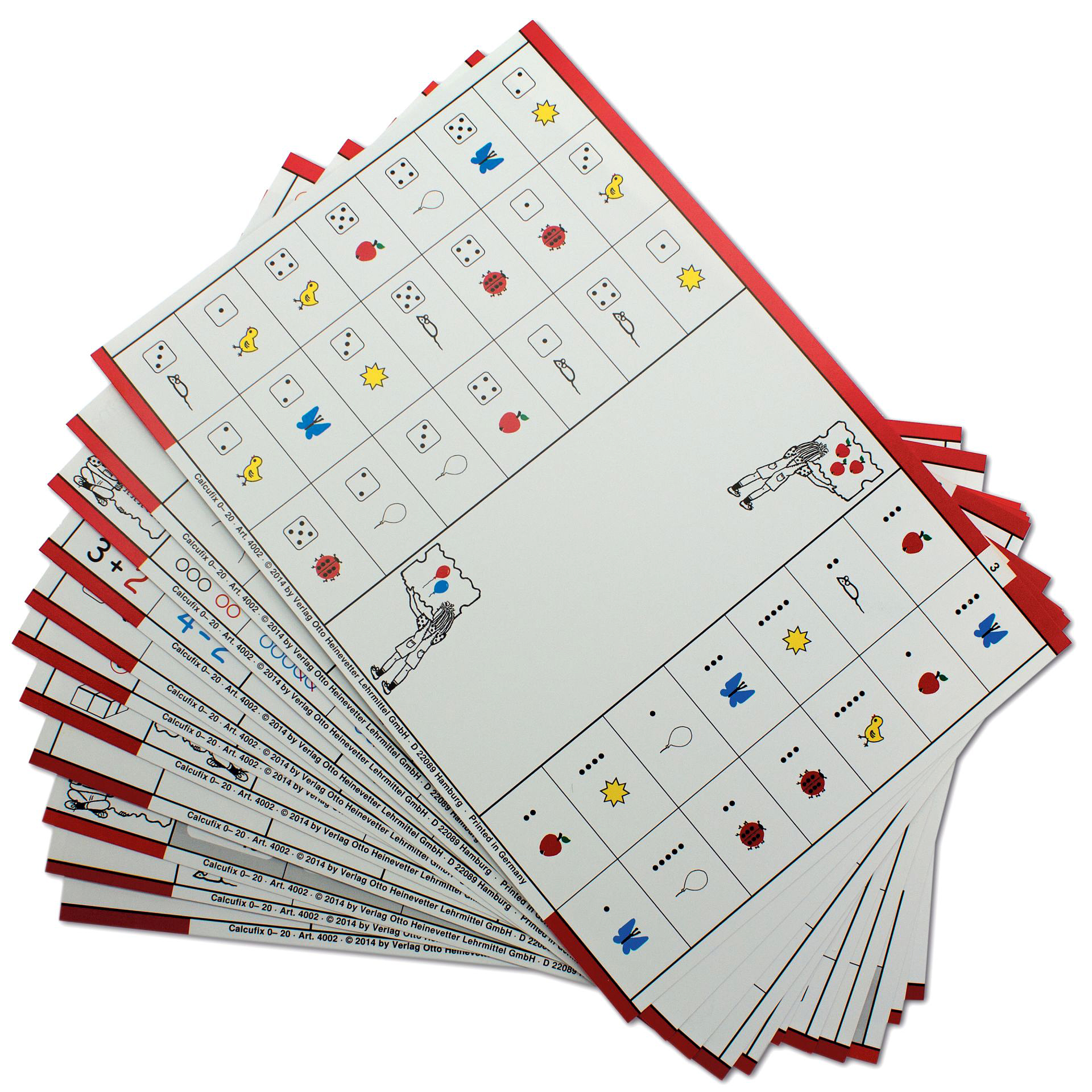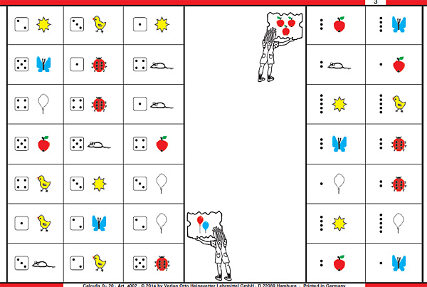 Съдържание / материали: 49 пластмасови елемента с вълнообразни краища с отпечатани цифрите от 1 до 20, 12 двустранно отпечатани хартиени работни листа със задачи, картонена кутия за съхранение.