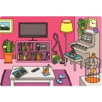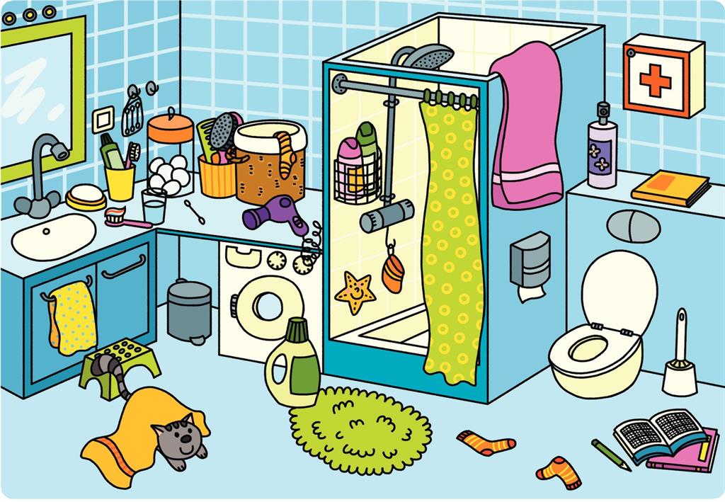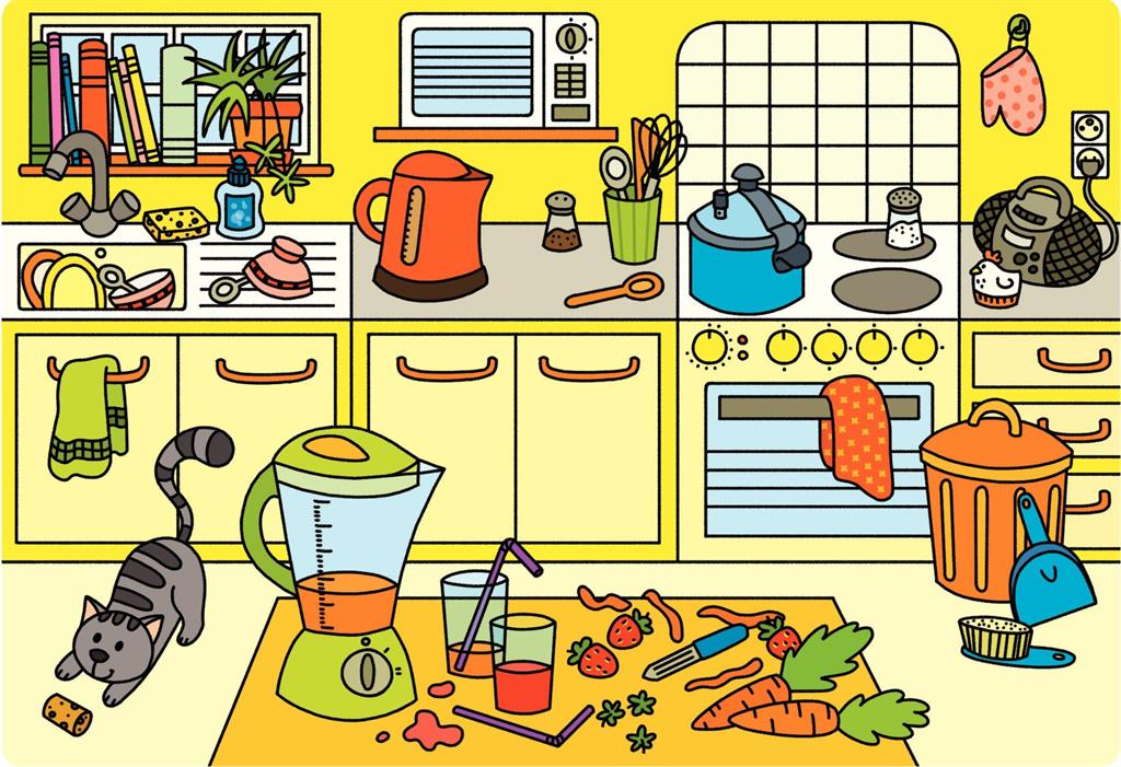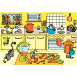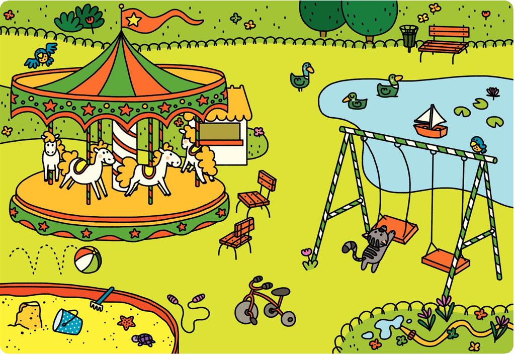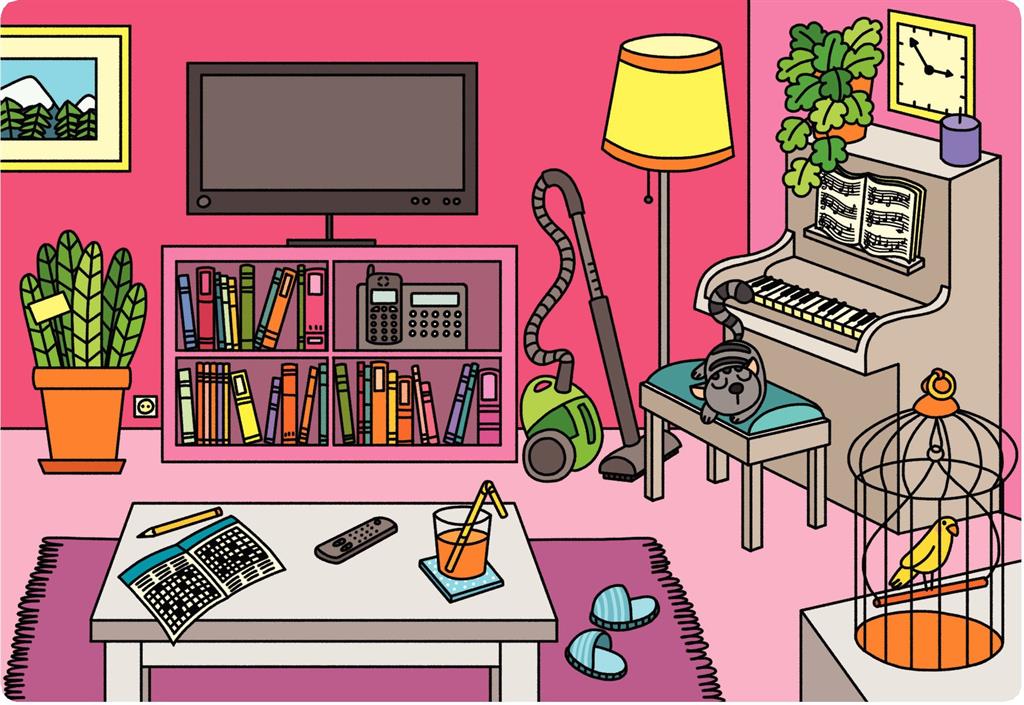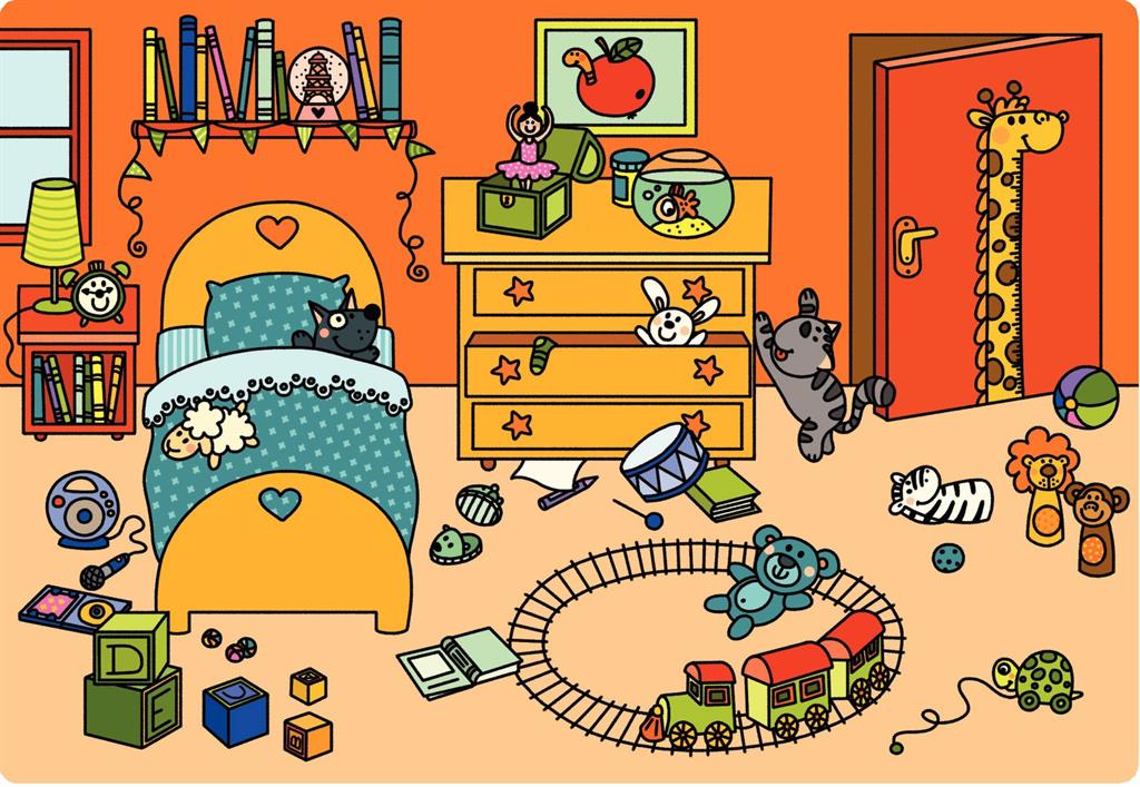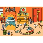 Играта включва шест богато илюстрирани сцени – кухня, баня, спалня, всекидневна, улица и парк, които децата изследват чрез слушане и наблюдение.