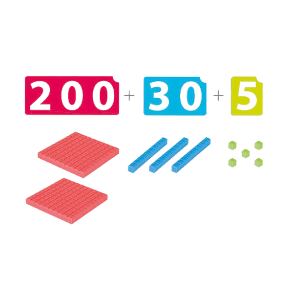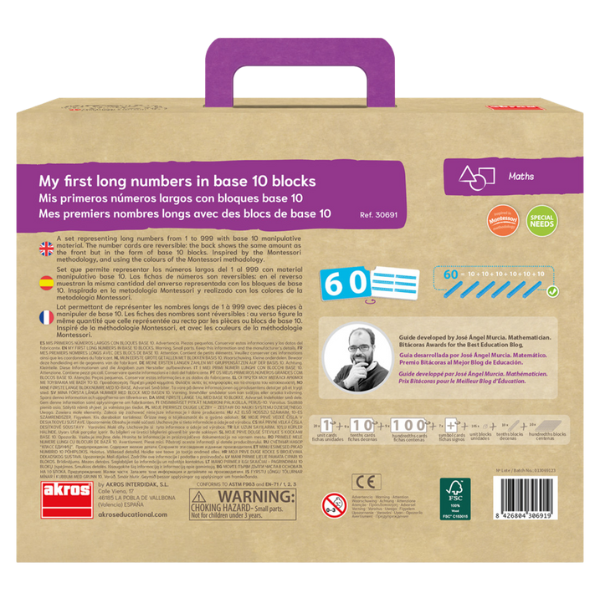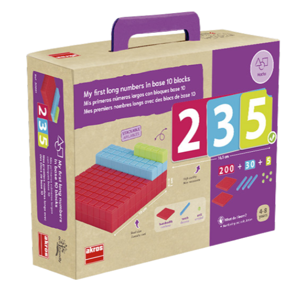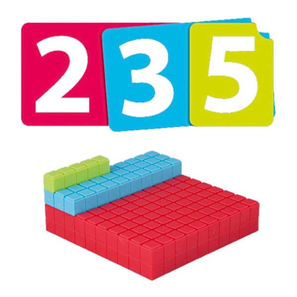 Комплект Математика – Моите първи трицифрени числа e математическа образователна игра, създадена, за да помогне на децата да разберат числата от 1 до 999, използвайки цветни блокчета, които визуално представят единици, десетици и стотици. Играта улеснява усвояването на основни математически умения чрез манипулативно и забавно обучение.