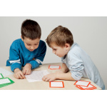 Съдържание / материали / размери: 4 големи базови карти от картон (20х20 см), 8 прозрачни фолиа (20х20 см), 21 картонени карти – шаблони с различни мотиви (10х10 см)