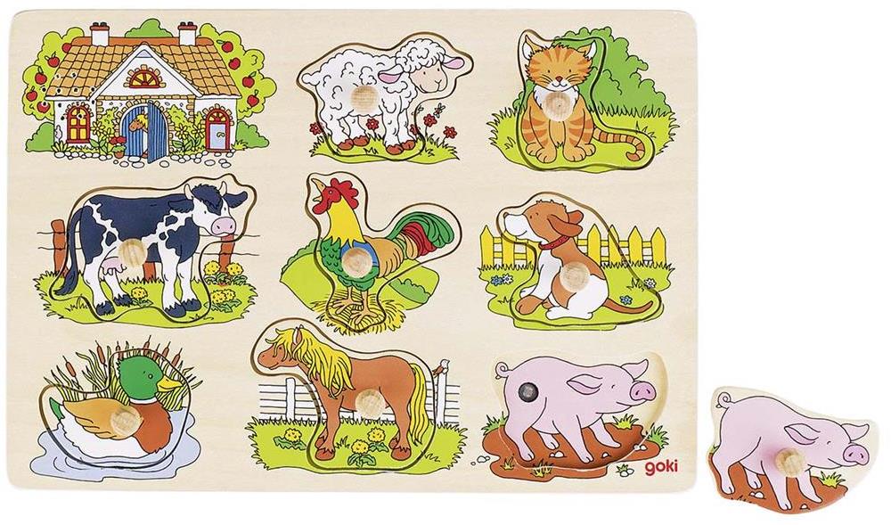 Музикален пъзел със скрити картинки и елементи с дръжка за вгнездяване. Елементите са с формата на домашни животни. Когато елементът се повдигне, се чуват звуците, които даденото животно издава.