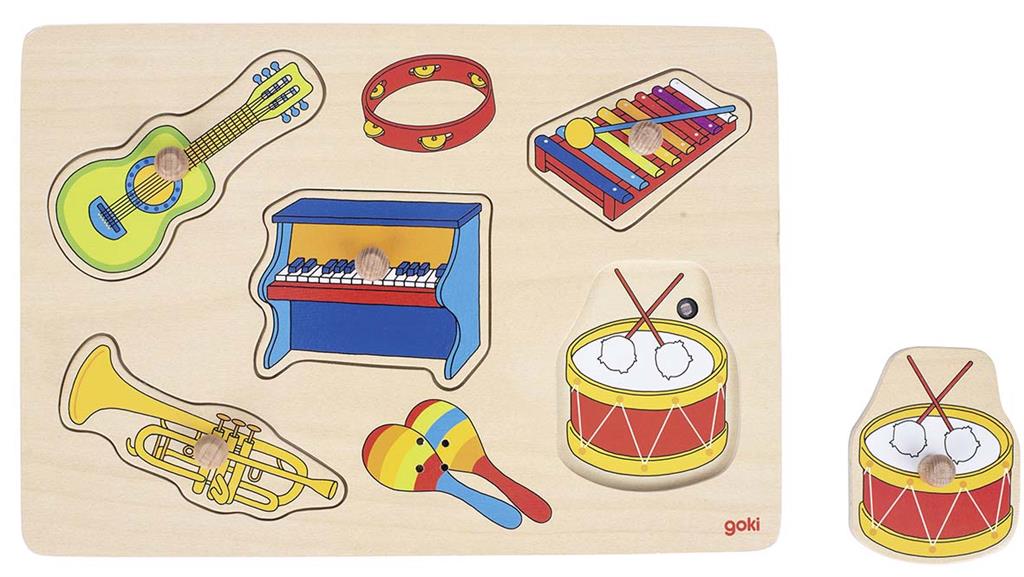 Музикален пъзел със скрити картинки и елементи с дръжка за вгнездяване. Елементите са с формата на музикални инструменти. Когато елементът се повдигне, се чуват звуците, които даденият инструмент издава.