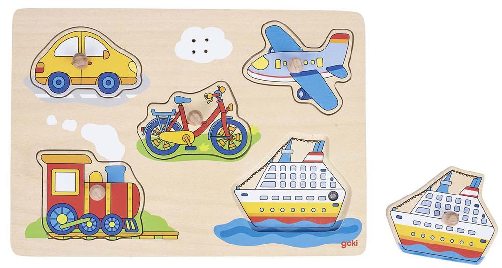 Музикален пъзел със скрити картинки и елементи с дръжка за вгнездяване. Елементите са с формата на превозни средства. Когато елементът се повдигне, се чуват звуците, които даденото превозно средство издава.