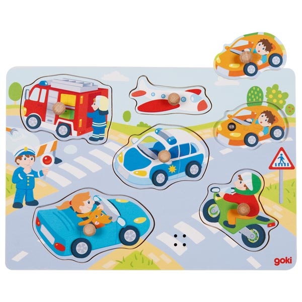Музикален пъзел със скрити картинки и елементи с дръжка за вгнездяване. Елементите са с формата на превозни средства. Когато елементът се повдигне, се чуват звуците, които даденото превозно средство издава.