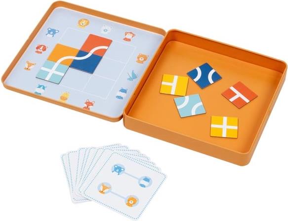 Забавна пъзел игра с магнитни елементи в метална кутия. Размери: 16,2×16,2×2,6 см Съдържание: 9 магнитни елемента, 10 карти със задачи, двустранен печат