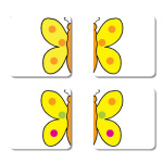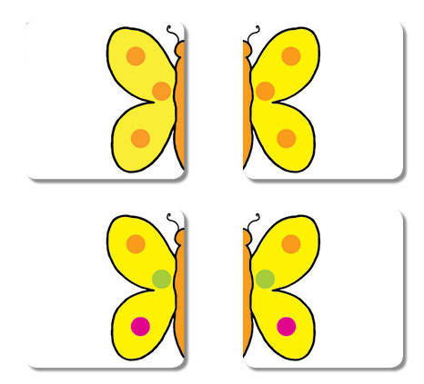 Съдържание: 24 цветни карти (размер 7,5 x 7,5 см); Две половинки на крилата с еднаква форма и комбинация от цветове образуват чифт карти / една пеперуда • Инструкции.