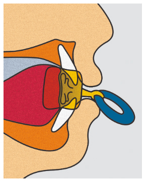 ПоставянеТренажорите MUPPY се използват подобно на бибероните залъгалки. Поставете пластината между устните и зъбите. Металната решетка ляга зад зъбите и не позволява на езика да застане между зъбите.
