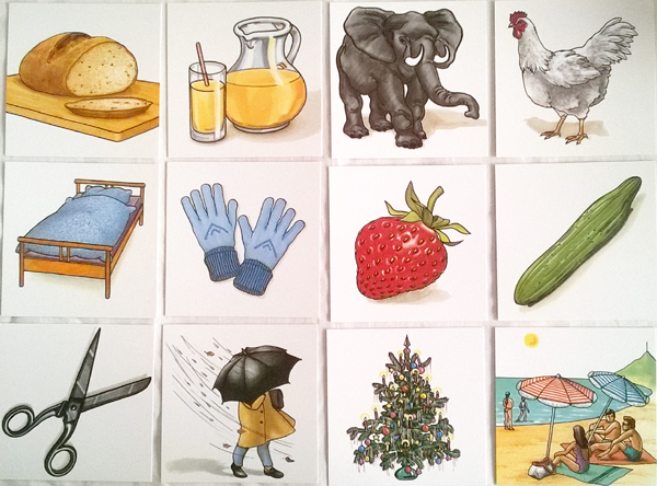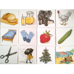 Комплект карти с цветни илюстрации за формиране на пасивен и активен речник. Картите могат да се използват и като стимулен материал за описание на обекти, съчиняване на истории, диференциране и класифициране по тематични категории и др. Застъпени са темите: домашни и диви животни, хранене и пиене, плодове и зеленчуци, в училище, къде живеят хората, облекло, календар и годишно време.