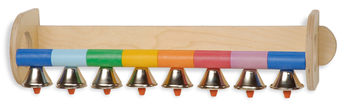 Панел с 8 метални камбанки за монтаж на стена или за настолна игра. Камбанките са с цветно кодиране на нотите – всеки цвят отговаря на определен тон – C мажор, диапазон от една октава