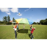 Играта с парашут осигурява двигателна активност за цялото тяло за хора от всякакви възрасти. Това е чудесно средство за развитие на базовата координация на тялото. Изработен е от цветен, супер лек, пожароустойчив полиестер с много здрави дръжки. Може да се използва за множество игри и дейности. Здраво (10 мм) въже е зашито по външния ръб на парашута, което позволява той да се използва от повече хора, отколкото са ръкохватките.