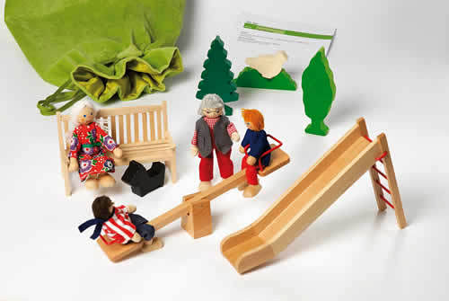 Съдържание: 11 части: 1 люлка, 1 пързалка, 1 бор, 1 топола, 1 гълъб, 1 пейка, 1 куче, 4 кукли (баба, дядо, 2 деца) от дърво. Доставя се в кадифена торбичка.