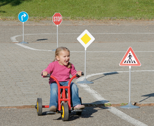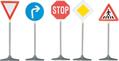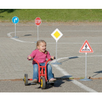 Комплект от 5 различни пътни знака, изработени от пластмаса. Подходящи за обучение по пътна безопасност. Не са устойчиви на атмосферни влияния, моля съхранявайте защитени. Височина: около 70 см