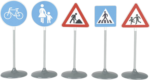 Комплект от 5 различни пътни знака, изработени от пластмаса. Подходящи за обучение по пътна безопасност. Не са устойчиви на атмосферни влияния, моля съхранявайте защитени. Височина: около 70 см