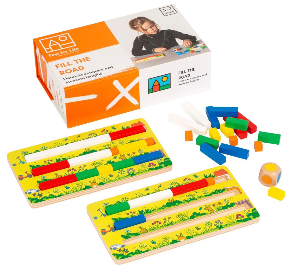 Павирайте пътечките върху работната дъска, като използвате блокчета с различна дължина. Играта помага на децата да се научат да напасват елементи, както и да измерват, сравняват и заменят обекти по дължина.