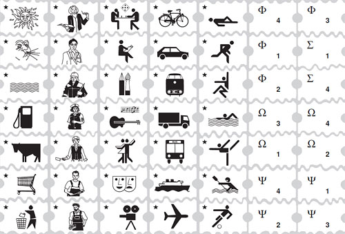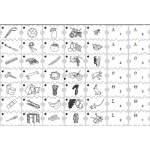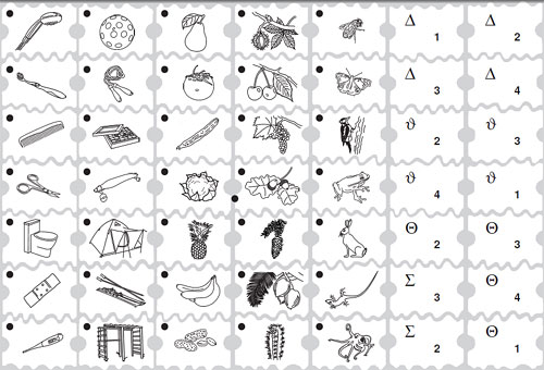 Съдържание / материали: 1 кутия, съставена от 2 части, които представляват табли за игра; 10 хартиени вложки, отпечатани от двете страни; 49 пластмасови чипа с илюстрации от двете страни; ръководство. В картонена кутия.