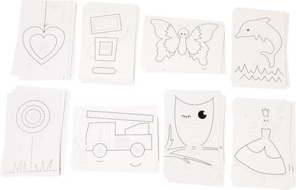 Картички от бял картон с перфорирани дупчици и нарисувани контури за бродиране. В комплекта са включени 8 различни мотива. Размери: 11х17 см Съдържание: 48 бр.