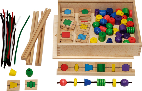 Съдържание / материали / размери: 48 големи дървени мъниста с различни форми (прибл. размер 3,5 см); 4 стойки, направени от бук; 48 дървени плочки с шаблони (прибл. 5,5х5,5 см); 20 меки пръчки за нанизване; дървена лакирана кутия (35х13х11 см)