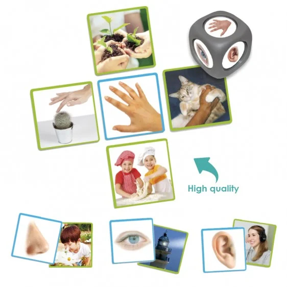 Свързване на карти: Играта съдържа 10 основни карти (сини рамки) с изображения на сетивните органи и 40 карти със зелени рамки, които представят различни ситуации, свързани с усещанията.