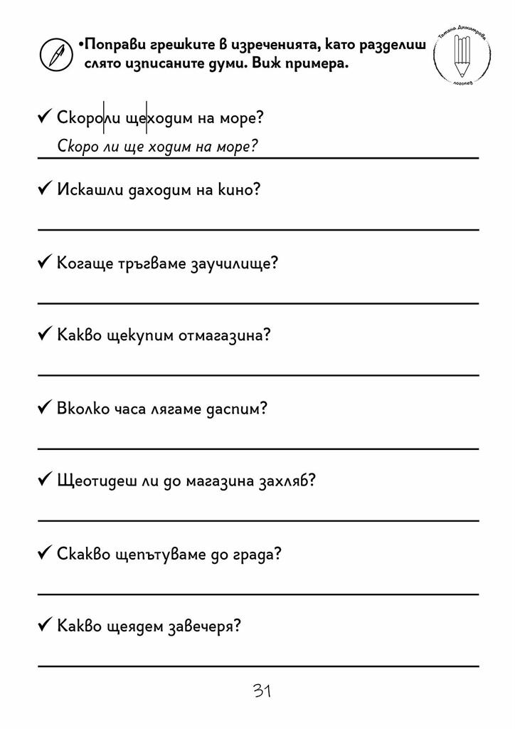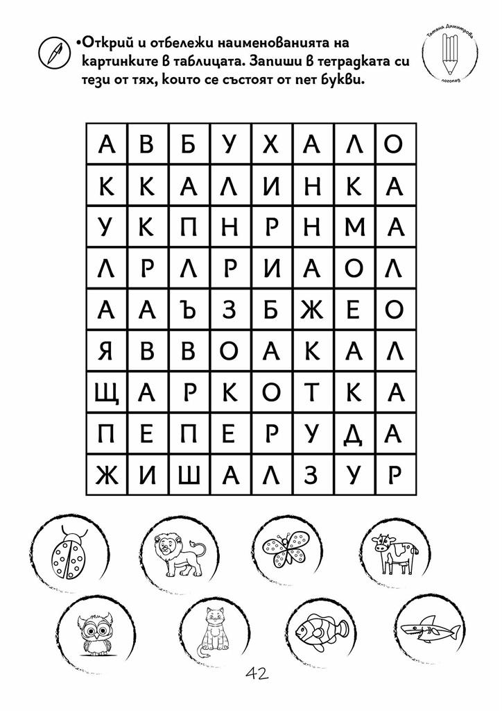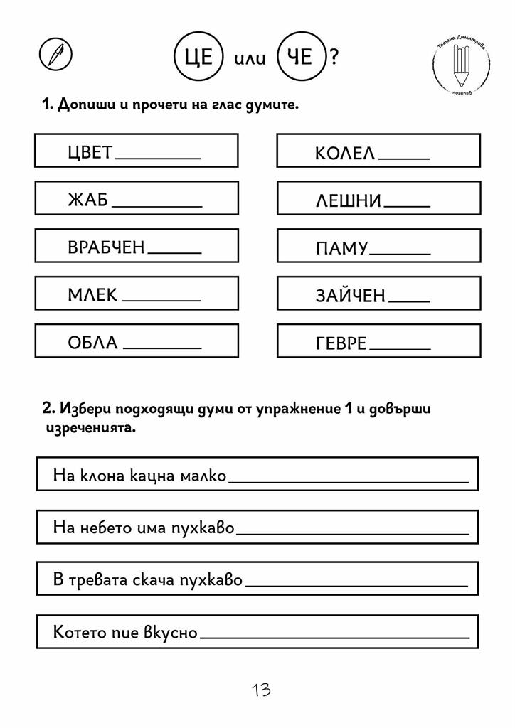 Съдържа 45 авторски работни листа във формат А4 и включва упражнения за: