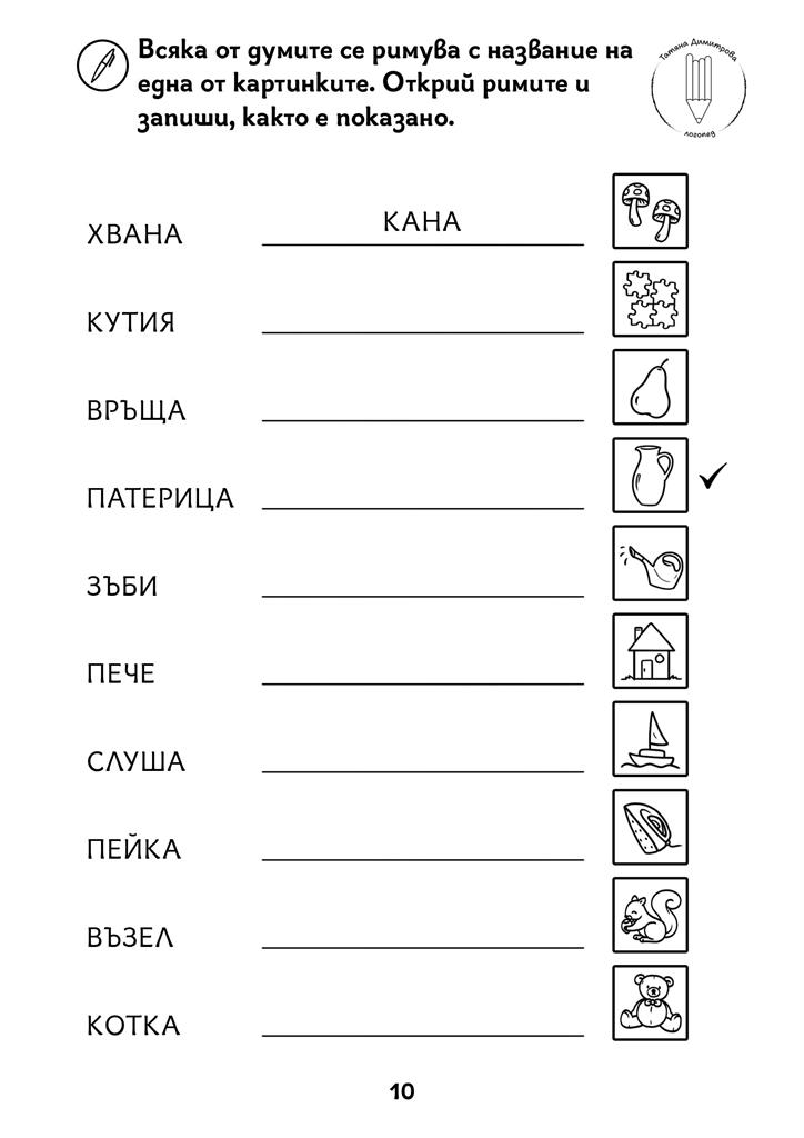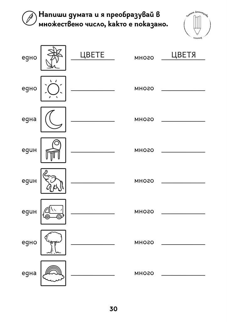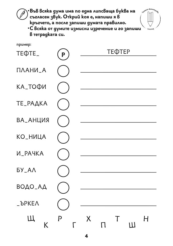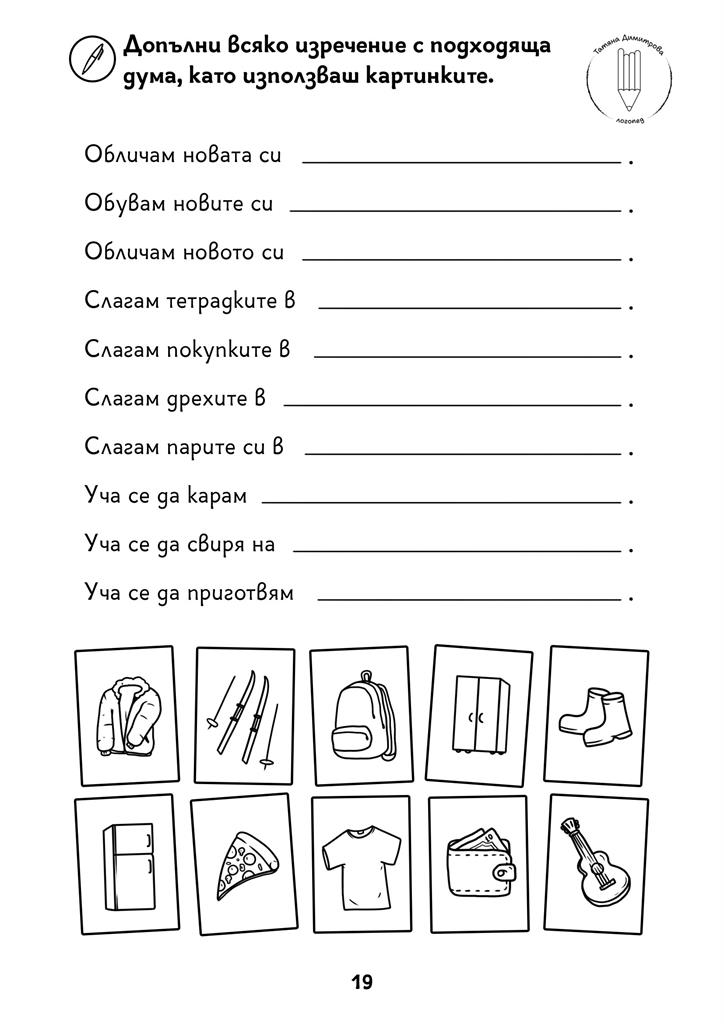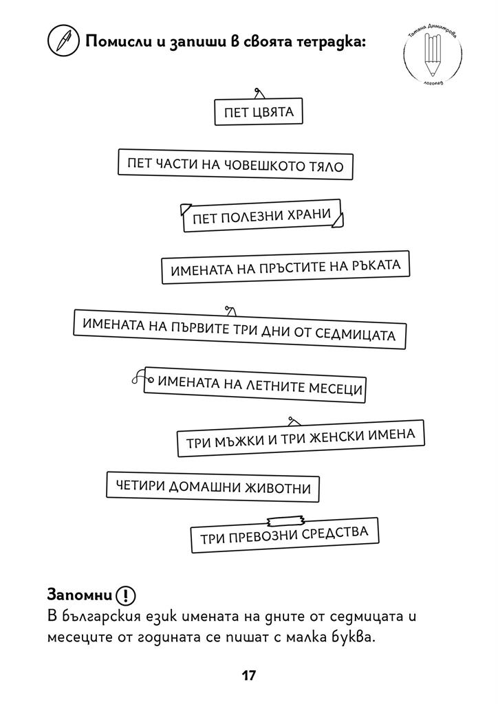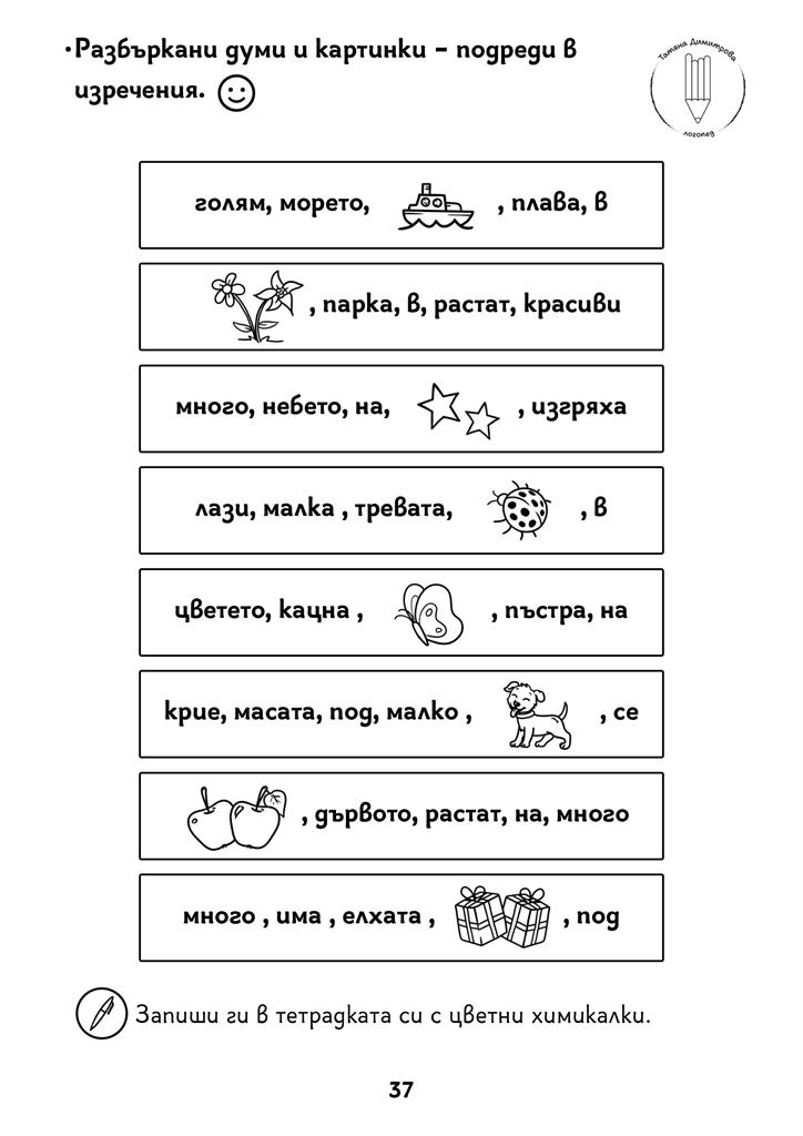 Авторско помагало с писмени упражнения на ниво дума и изречение. Развива по забавен начин процесите четене и писане, графомоториката и мисленето при малките ученици и децата със специални образователни потребности. Черно-белият формат дава възможност да се пише и оцветява в сборника. Следването на поредността на задачите в помагалото Не е задължителна.