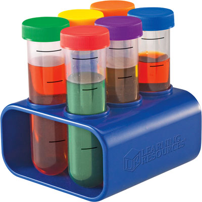 Комплект от 6 големи епруветки, изработени от пластмаса, с различни цветни винтови капачки. В стабилна поставка.