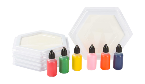 Комплект подложки с тампони за цветни печати. За самостоятелно пълне с водоразтворимо мастило. Съдържание: 6 шестоъгълни подложки с тампони за мастило в 6 цвята, жълто, оранжево, червено, розово, тъмно зелено, тъмно синьо Размери: 14×14 см