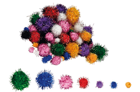 Опаковка със 100 бр. помпони. Цветове – асорти. Изработени от мека синтетична вълна с полиестерни и метални нишки Размери: Ø 0,5-3 см