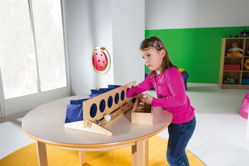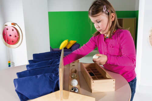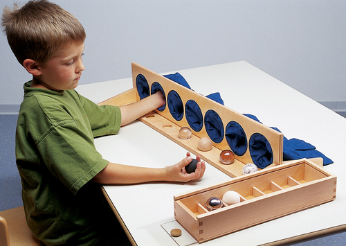 Предложения за игра: Различни игри за тактилно разпознаване. Дейностите може да варират според способностите на детето. Скрийте по една топка от всяка от седемте двойки в тактилните торбички. Вземете някоя от останалите топки и я подръжте в ръката си. Какво е усещането? Гладка ли е на пипане, или е студена и метална? Тежка ли е, или е лека? След като сте добили впечатление за топката в ръката си, опитайте да намерите съответстващата й топка в някоя от торбичките! Играта е наистина стимулираща и децата могат да прекарат часове в изучаване характеристиките на отделните предмети.
