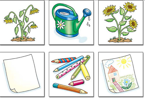 Комплектът съдържа 24 лесни серии картини, всяка състояща се от 3 карти. Играта е създадена специално за развитие на логическото мислене и езиковите умения.Първата карта от всяка серия показва предмет, човек или ситуация, които се появяват отново в третата карта, но в променена форма. Целта на играта е да се открие какво може да е нарисувано на втората карта – инструмент, съд или машина, които са използвани за промяната.