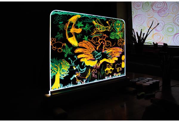 Творческият процес става още по-забавен, когато включите в него и ефектите на светлината. Стъкленият статив има вградена LED подсветка в 16 цвята и 4 режима на работа. Управлява се с дистанционно. Така всеки път създавате нов шедьовър само като смените осветлението. Не изтривайте веднага рисунките, които сте създали – променете цвета и се насладете на неоткритите детайли на рисунката.