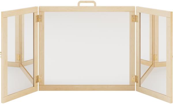 Преносимо сгъваемо логопедично огледало. Изработено от акрил, за да гарантира безопасността на децата, като позволява по време на работа с него, децата да се виждат както фронтално, така и в профил. Един необходим помощник, който винаги да бъде под ръка.