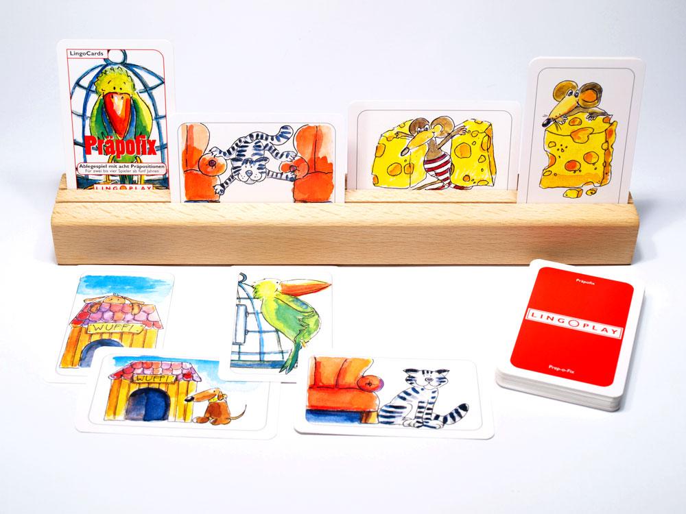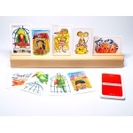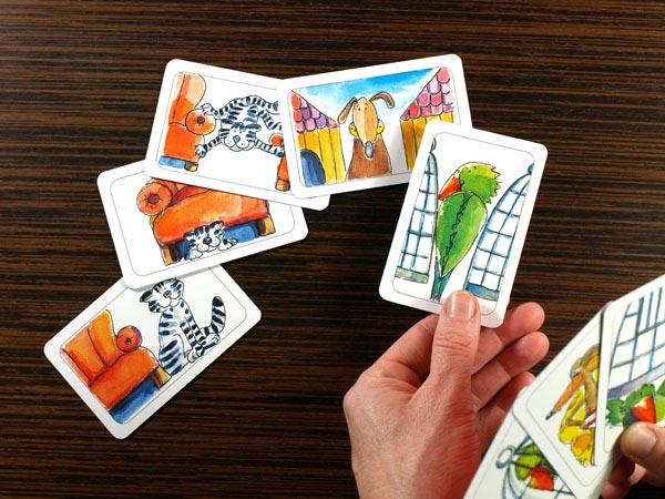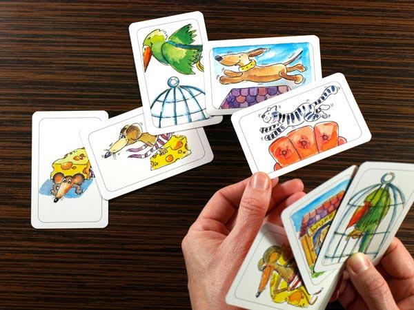 Мотиви на картите: куче, котка, мишка и птица, които заемат различни позиции (на, под, зад, пред, над, до, в и между) спрямо различни обекти (колиба, кресло, сирене и клетка)