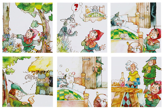 Съдържание: 6 приказки, представени чрез серии от по 7-16 картинки. Общо 72 цветни карти с размери 9х9 см. Включени инструкции на български език