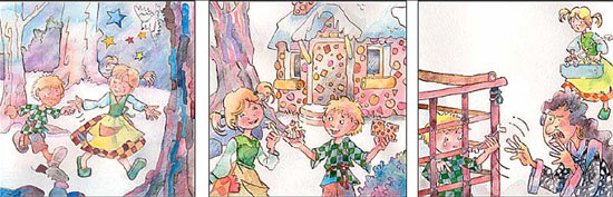 Представени са приказките: Хензел и Гретел, Румпелщилцхен, Белоснежка и Червенорозка, Рапунцел, Грозното патенце, Звездните талери