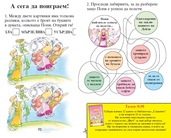 В края на книгата децата ще намерят читателски дневник, в който могат да залепят своя снимка, да дадат оценка на книгата, да нарисуват великан и др. Всички книги от библиотека ‘Славейче’ съдържат талон с номер – при събиране на 12 талона, децата печелят персонална грамота от издателство ‘Фют’ за най-добър читател и специална папка, в която да подредят страничките на своя първи читателски дневник.