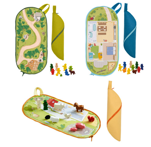 Откопчайте ципа, разстелете игралното поле, дайте свобода на въображението и започнете да играете! Комплектът включва 3 игрални полета (ферма, приказна гора и семейно жилище) и различни фигурки, които насърчават децата всеки път да измислят всеки път нови истории. С пашкулите могат лесно да се пресъздават сцени от ежедневието или приказки като ‘Червената шапчица’, ‘Хензел и Гретел’ или ‘Принцът жабок’.