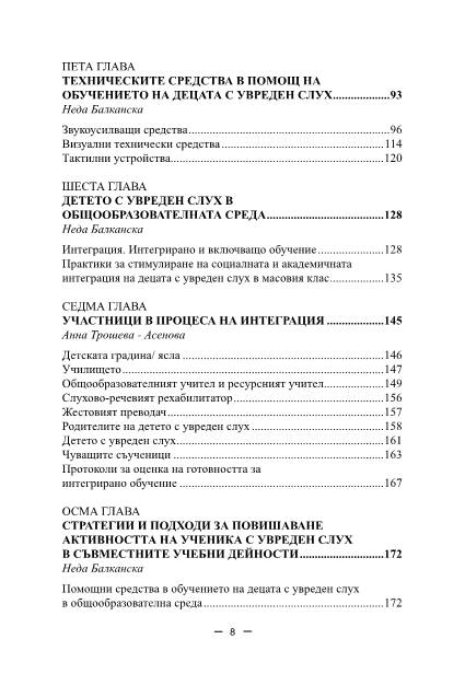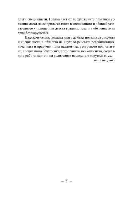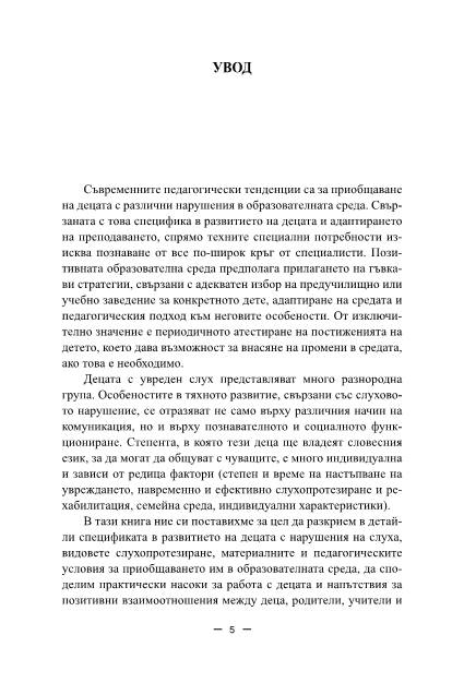 Основната цел е да се разкрие в детайли спецификата в развитието на децата с нарушения на слуха, видовете слухопротезиране, материалните и педагогическите условия за приобщаването им в образователната среда, да споделим практически насоки за работа с децата и напътствия за позитивни взаимоотношения между деца, родители, учители и други специалисти. Голяма част от предложените практики успешно могат да се прилагат както в специалното и общообразователното училище или детска градина, така и в обучението на деца без нарушения.