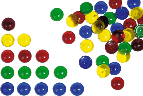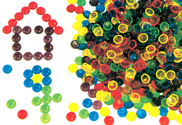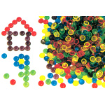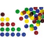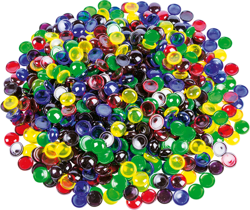 Съдържание / материали / размери: Кръглите камъчета са изработени от висококачествена прозрачна пластмаса в 5 цвята (жълт, виолетов, зелен, син и червен). Размери: диаметър: 19,5 мм Съдържание: 1 кг / около 650 бр. в найлонова опаковка