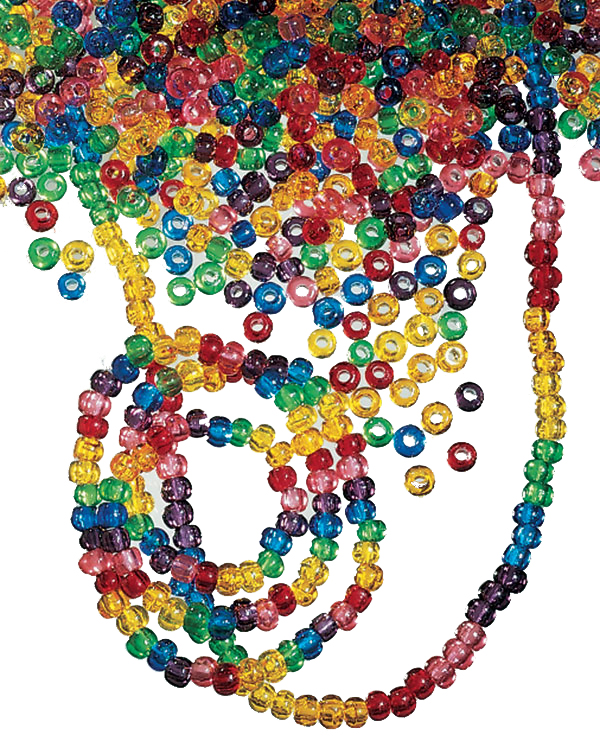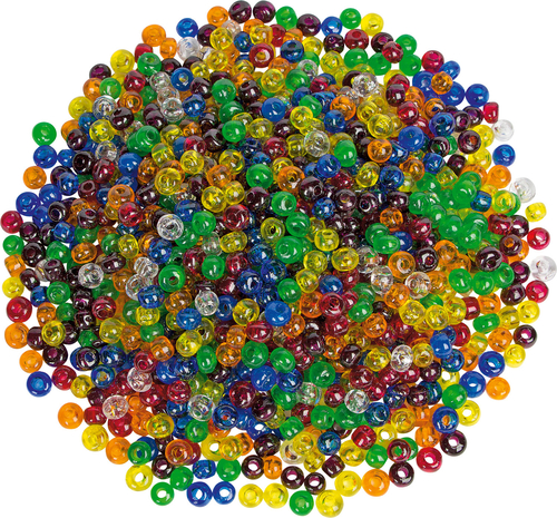 Висококачествени прозрачни пластмасови мъниста (Ø около 1 см). Комплектът съдържа 1000 бр. мъниста в различни цветове. Опаковка – найлонова торбичка.
