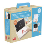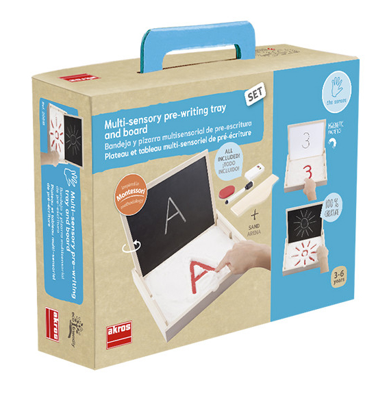 Пясъчна табла в кутия e комплект за предписмени умения, създаден, за да подпомогне развитието на фината моторика, координацията око-ръка и концентрацията при децата. Пясъчната табла осигурява интерактивен и сетивен подход към ранното писане, като позволява на децата да се упражняват в изписването на форми, букви и числа чрез допир.